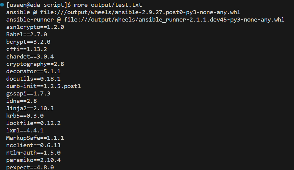 Playbookは、ローカルホストに対してpip freezeコマンドを実行、標準出力をテキストファイルに保存