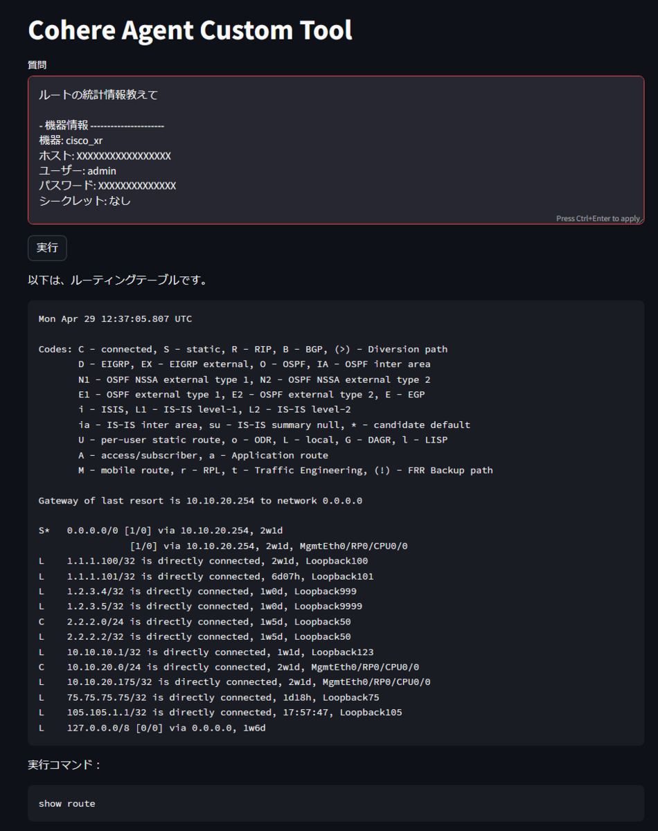 # +-+-+-+-+-+-+-+-+-+-+-+-+-+-+-+-+-+-+-+-+-+-+-+-+-+-+-+-+-+-+-+-+-+-+-+-+-+-+-+-+-+- st.set_page_config(layout="wide") st.title("Cohere Agent Custom Tool") # ツール定義 tools = [NetworkDevice()] # ツールをリストにまとめる # プロンプト定義 prompt = ChatPromptTemplate.from_template(template) command_prompt = ChatPromptTemplate.from_template(command_template) command_parser = JsonOutputParser(pydantic_object=CommandList) # LLM定義 command_r = ChatCohere(model="command-r-plus-08-2024", temperature=0) command_gen = command_prompt | command_r | command_parser # エージェント定義 agent = create_cohere_react_agent( llm=command_r, tools=tools, # ツールをエージェントに渡す prompt=prompt # プロンプトもエージェントに渡す ) # AgentExecutorを定義 agent_executor = AgentExecutor( agent=agent, # 作成したエージェントを指定 tools=tools, # ツールも再度渡す verbose=True # 実行時の詳細出力を有効にする ) # フォーム if "network_device_info" not in st.session_state: st.session_state.network_device_info = NetworkDeviceInfo(host="", username="", password="", secret=None, device_type="" ) device = st.session_state.network_device_info.dict() # 認証フォーム if st.button("認証情報"): device_auth_form() # デバイス情報の生成確認 question = st.text_area("質問", value="ルートの統計情報教えて") # チェーンにデータを渡して実行 chain = ( { "device": RunnablePassthrough(), # 生成されたデバイス情報を渡す "commands": command_gen, # 生成されたコマンドを渡す "question": RunnablePassthrough() # 質問を文字列として渡す } | agent_executor # ここでエージェントを使ってコマンド実行 ) if st.button("実行"): with st.spinner("生成中...."): result = chain.invoke({"question": question, "device": device}) st.write(result['output'])