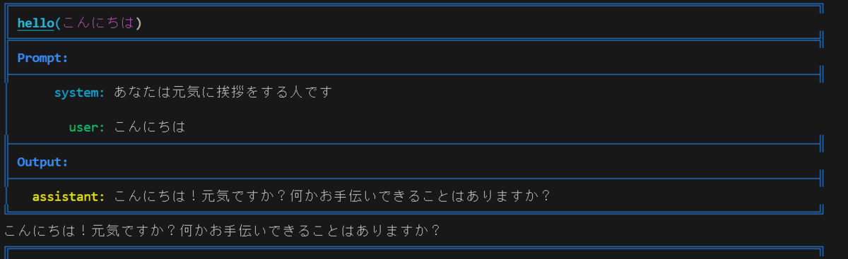 @ell.simple(model="gpt-3.5-turbo", client=client) def hello2(message : str): return [ ell.system("あなたは元気のない挨拶をする人です"), ell.user(f"{message}") ] print(hello2("こんにちは"))